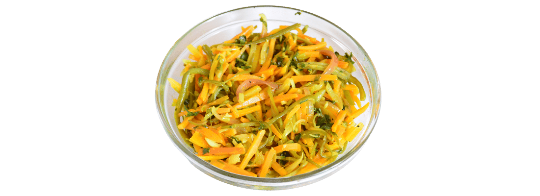 Faites chauffer l’huile. Ajoutez les oignons, l’ail, le sel et le gingembre pilé, le curcuma et éventuellement le piment. Faites colorer le tout. Ajoutez les haricots verts, mélangez le tout. Une fois mélangé, ajoutez les carottes et les choux blancs Mélangez pendant 5 minutes à feu doux. Éteignez.
